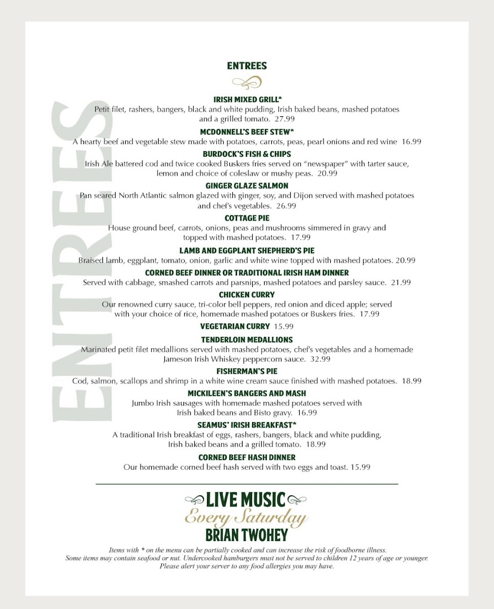 Marinated steak tips, rashers, bangers, blackand white pudding, Irish baked beans, a grilled tomato and mashed potatoes